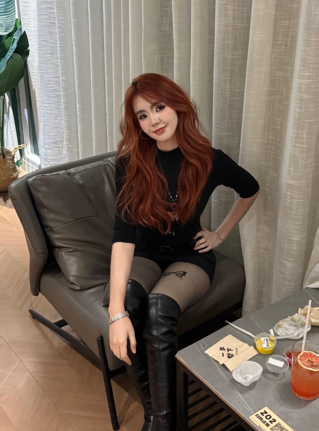 优雅黑裙,复古椅背,时尚眼镜,精致妆容,自信微笑。