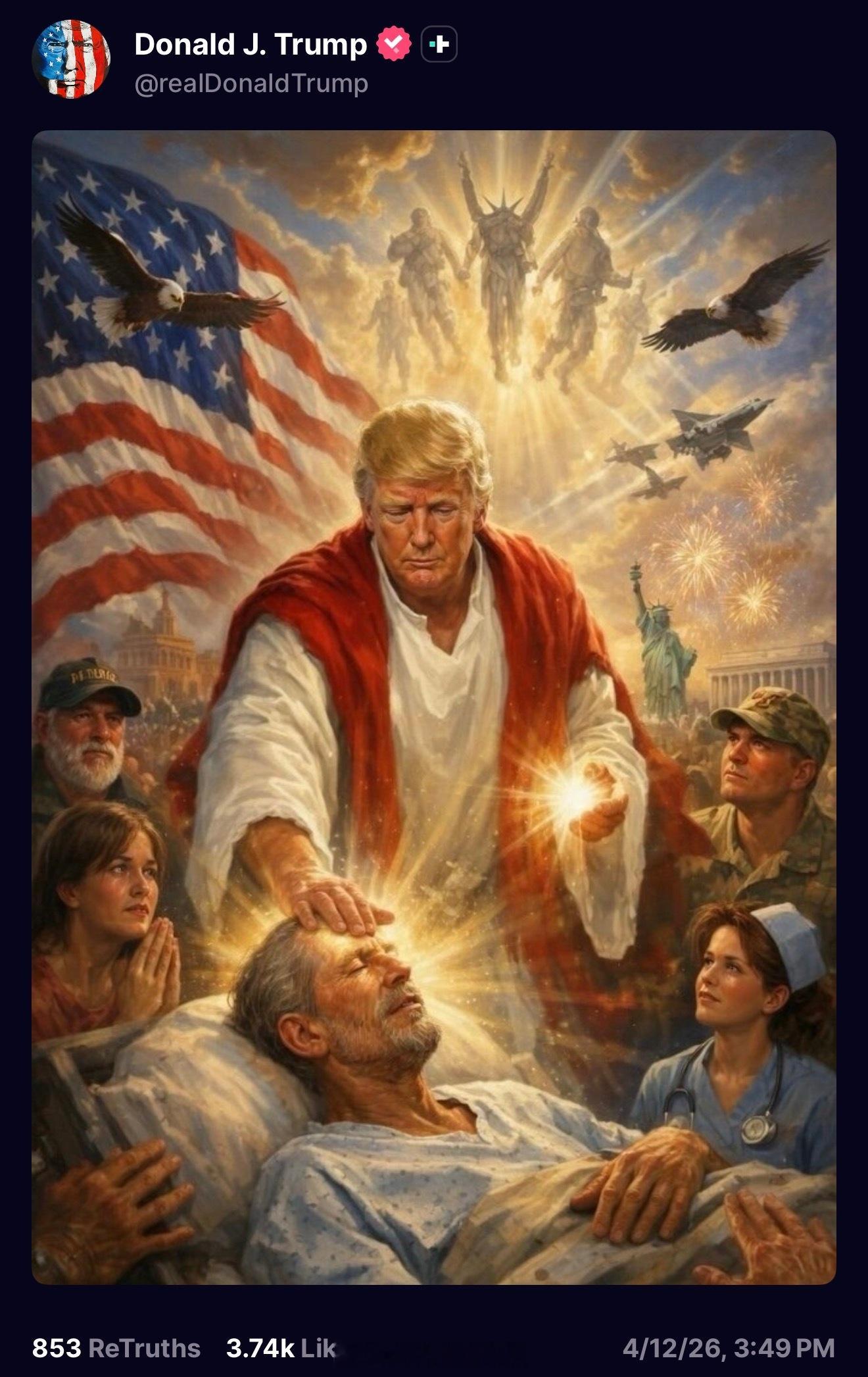 川普今天发的耶稣梗图,原图可能来自2月份Nick Adams发的。但画面上方中间