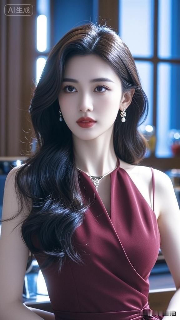 这位女士穿着蓝色礼服,看起来优雅迷人。