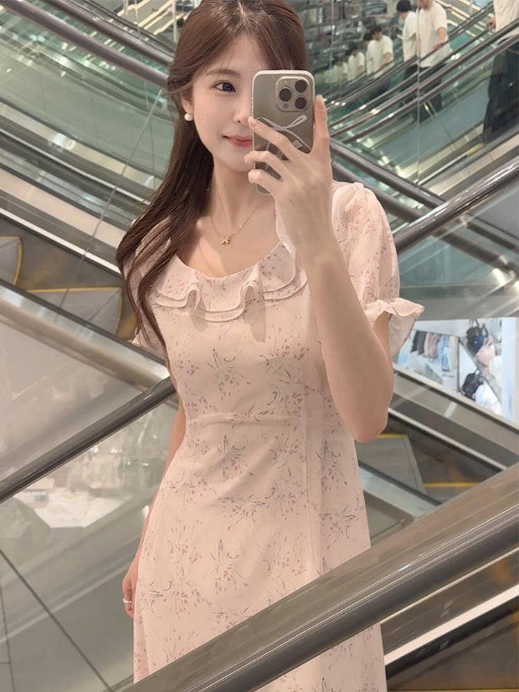 今年流行的漂亮粉色泡泡袖收腰连衣裙子
