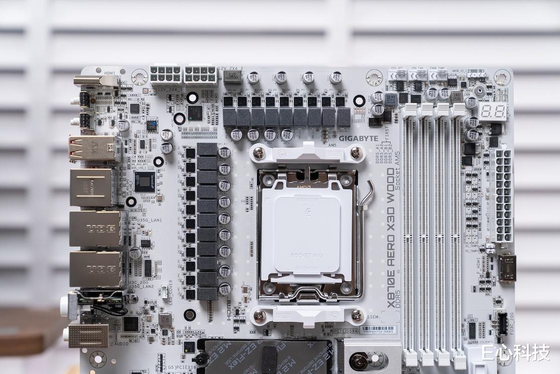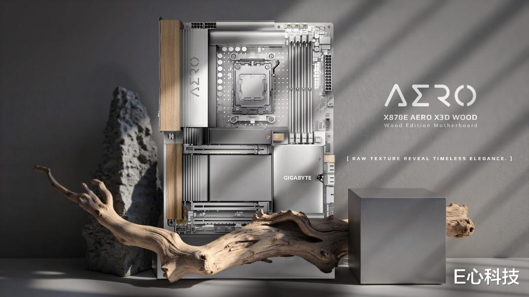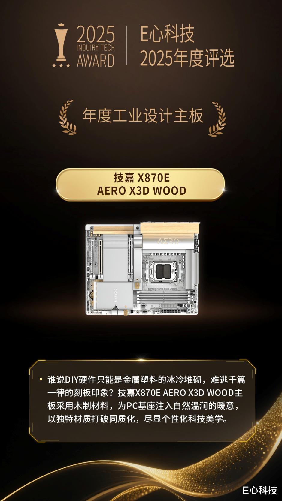 在本次E心科技2025年度评选中,技嘉X870E AERO X3D WOOD被评为“年度工业设计主板”。