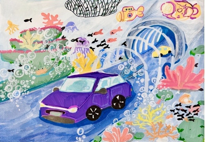 设计理念:祖国强大,不止潜水艇能入海底,车沿海底隧道行驶,也可以一路观赏水上世界,梦幻且感叹科技的力量!