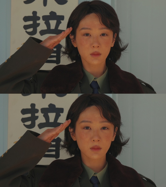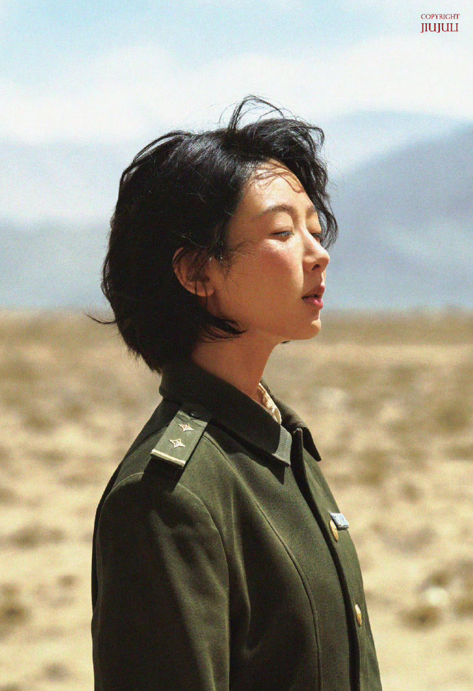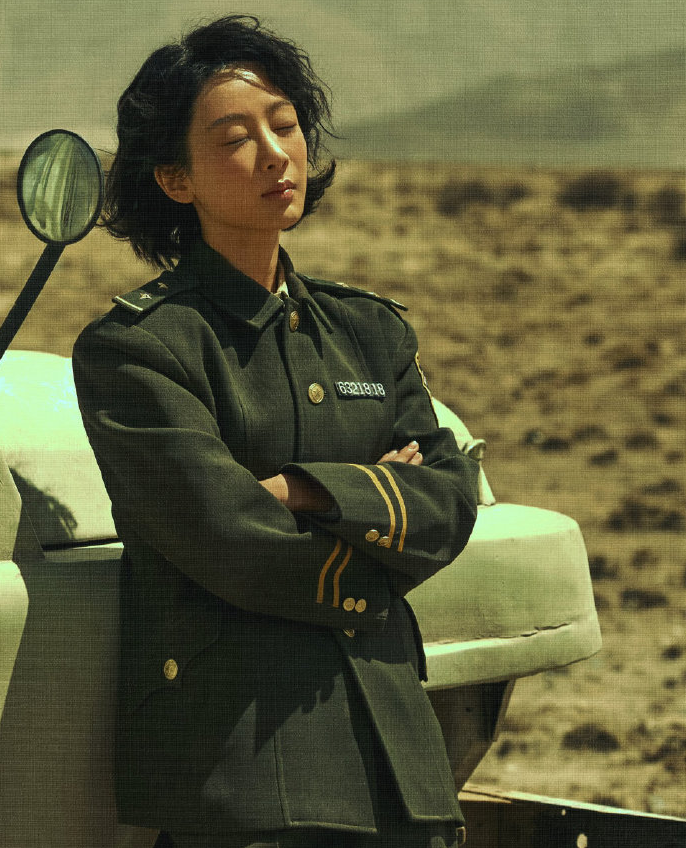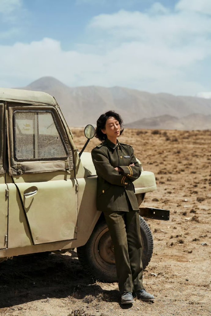 穿上制服的她,双手抱肩靠在车旁,风吹起她的短发,她眼神深情望着远方,背后是连绵巍峨的群山,拍戏的时候杨紫一度需要吸氧,但是呈现出来的效果却很有戍边氛围。