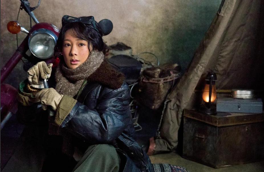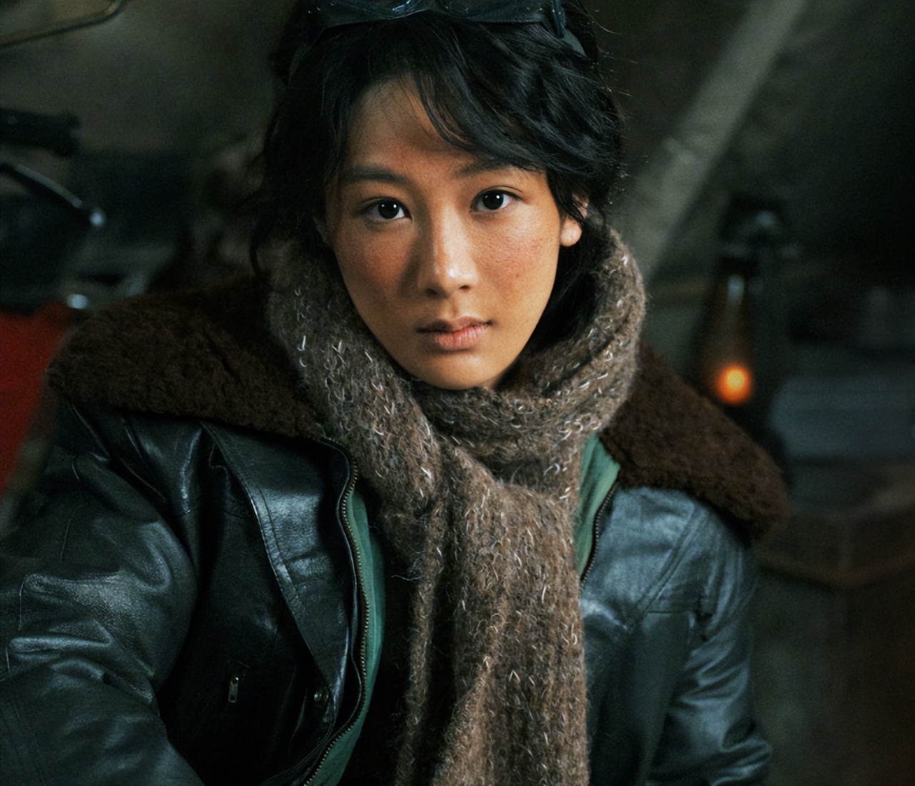 身穿皮夹克,脖上围着粗线围巾,带着脏手套,坐在颇具年代感的斑驳旧围墙、铁箱、煤气灯和摩托车的环境里,一派干练飒爽。