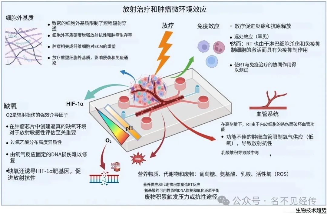 芯片控制氧分布、ECM、血管、免疫浸润,剖析机制(详见图4的重要内容:图4概述TME特征如ECM、缺氧、血管对放疗响应的影响。