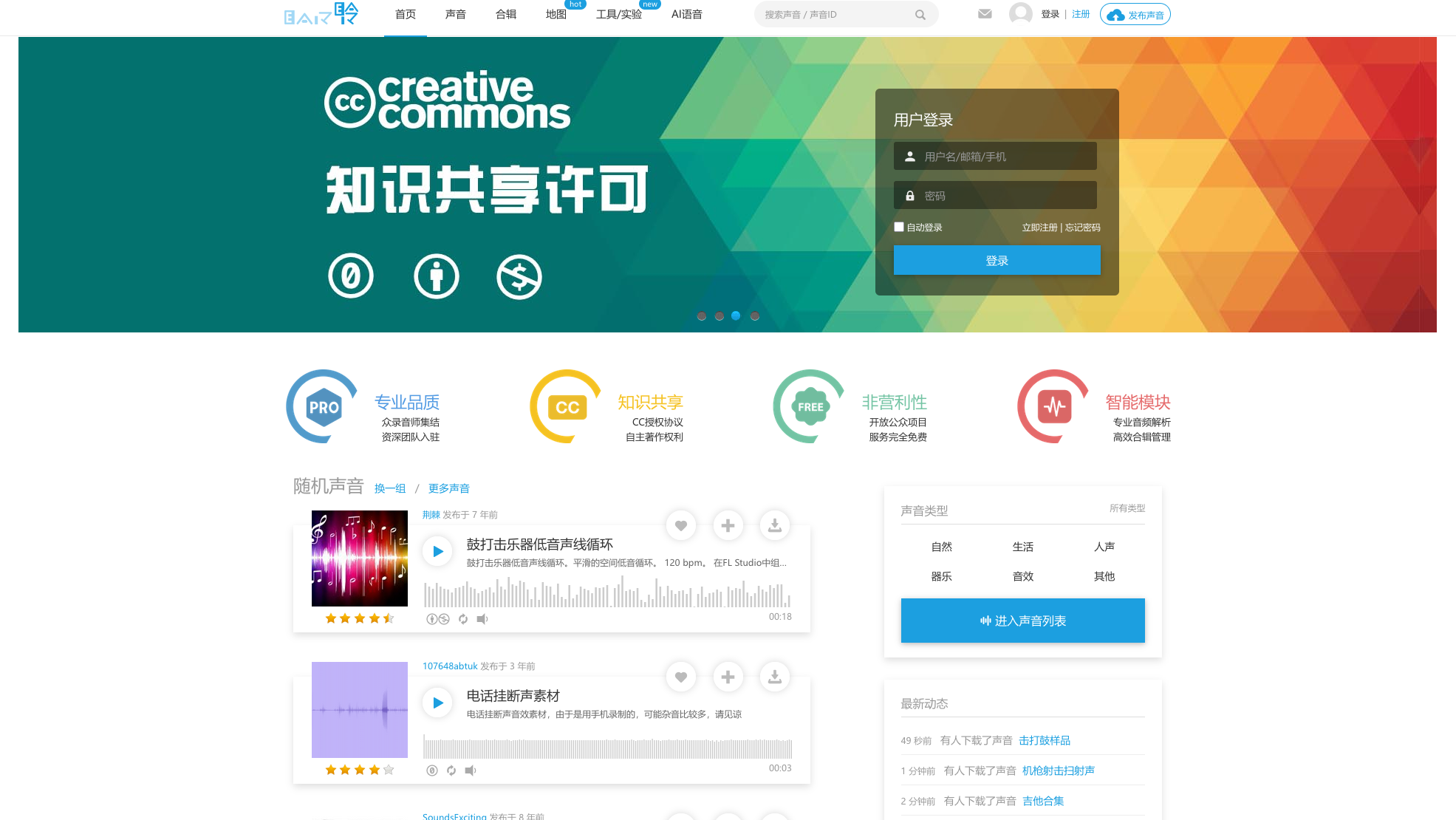 谁懂啊!耳聆网绝对是国内隐藏的环境音效宝藏站,作为有声学学会支持的专业平台,它的素材质量堪称 “录音棚级别”~ 亲测 1 年半,上面的环境音效大多是专业录音师或爱好者实地录制的原生素材,比如深山里的溪流潺潺、老巷里的自行车铃铛、老电影院的胶片转动声,甚至还有罕见的古建筑风声、传统市集叫卖声,小众又有故事感。分类清晰到离谱,按 “自然景观 / 城市生活 / 工业环境 / 文化场景” 细分,还能按地域筛选本土特色音效。所有素材完全免费,部分支持商用(标注 CC-BY 授权,署名即可),虽然更新速度不算快,但每一条都是精品,音质无损无杂音,用来做纪录片、人文短视频的背景音,瞬间提升高级感。