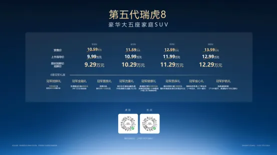 第五代瑞虎8上市限时抢鲜价为9.29万元起,同时还诚意推出8重冠军礼遇,让消费者购车更轻松、用车更省心!