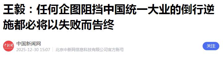 在12月30日的国际形势与中国外交研讨会上,王毅把话说得很明白:台湾问题是中国核心利益中的核心,任何阻挡统一的行为,都注定失败。