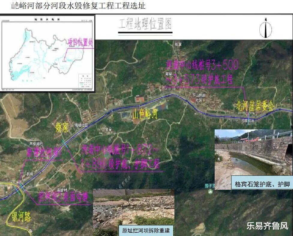 山色峪河部分河段水毁修复工程位于青岛市城阳区夏庄街道,由城阳区夏庄街道办事处建设,建设项目起止点位于山色峪河道河崖村段至南坡村段沿线。项目主要工程内容包括三部分内容。一是对现状拦河坝按原规模拆除重建一座M15浆砌块石拦河坝;二是对南坡矫家段河道内现状拦河坝表面勾缝脱落处进行修复;三是道河崖段至南坡段沿线左岸部分河底进行格宾石笼护底、护脚。(工程均为在原坝体进行除险加固)。注:山色为同一个字。