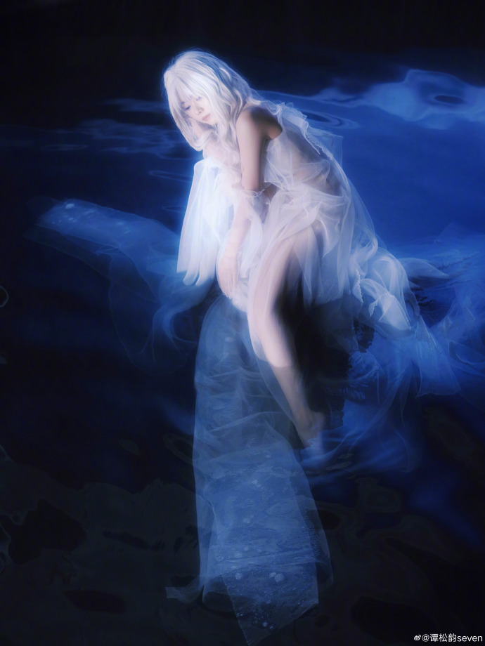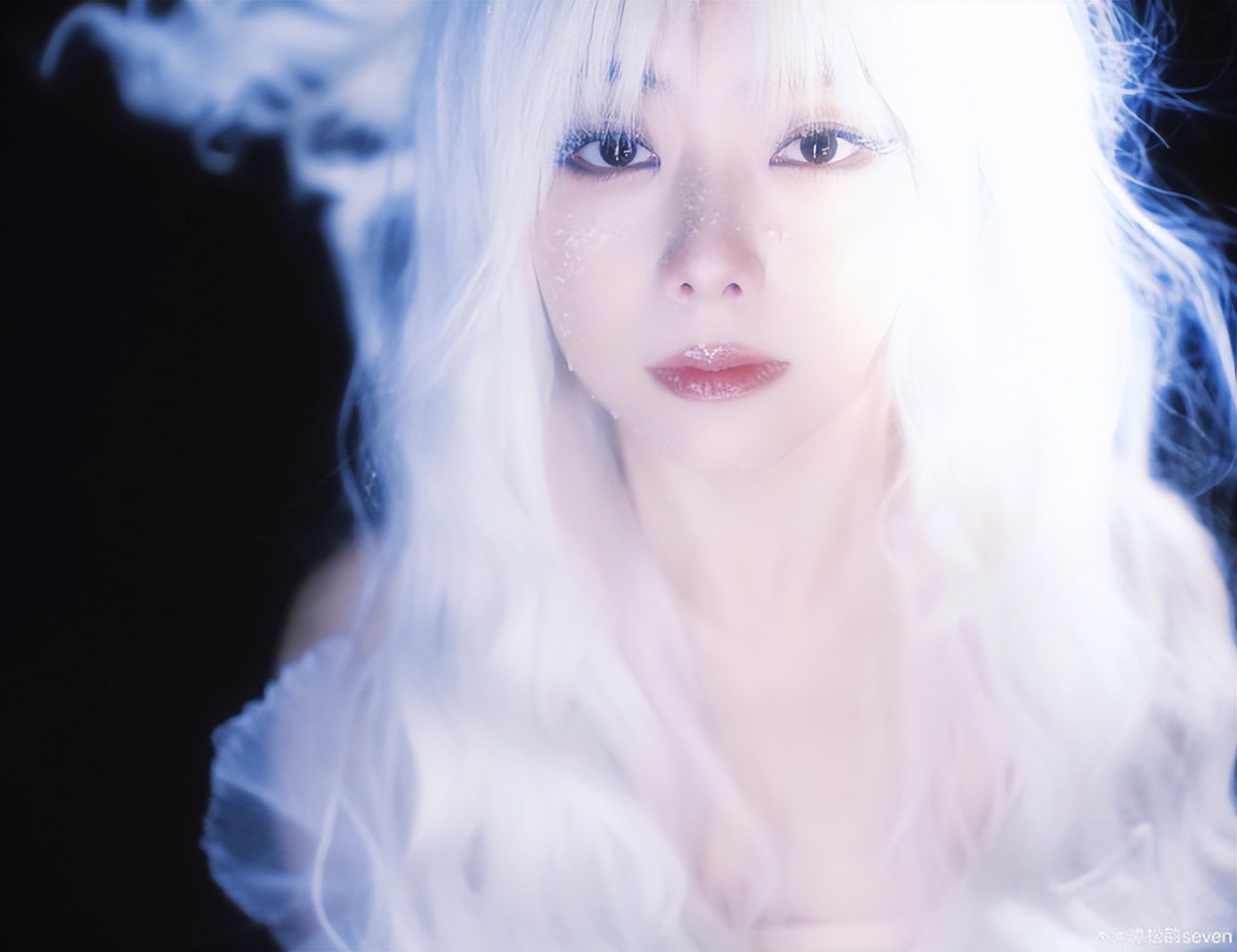 她低着头,浅白发裹着冷蓝光,发梢垂在身前。这头白发该是角色命运的注脚,或许是为了守着某段念想、等过某个人,才熬白了发。现实里的她总鲜活又轻快,可这低头的模样,是把角色的沉都揣在了发梢里,连光都裹得没了实感。