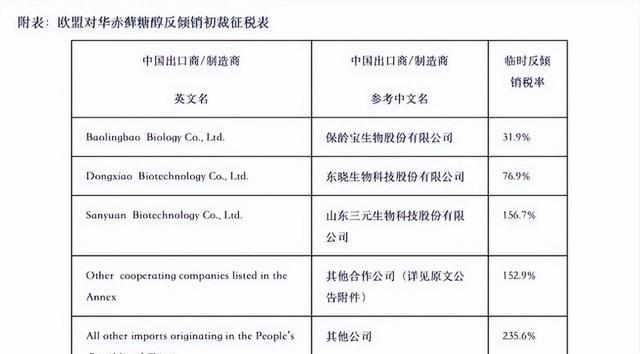 235.6%的高额关税,几乎等同于将中国赤藓糖醇产品排除在欧洲市场之外。