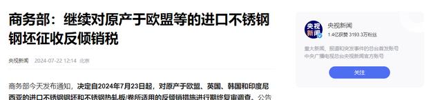 就在欧盟宣布这一决定后不久,中国政府迅速做出反应,宣布对欧盟不锈钢产品启动反倾销调查。