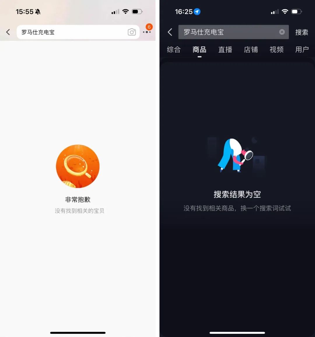 现在去天猫搜罗马仕充电宝,页面会显示 "没找到符合条件的商品",京东、抖音旗舰店也是如此。