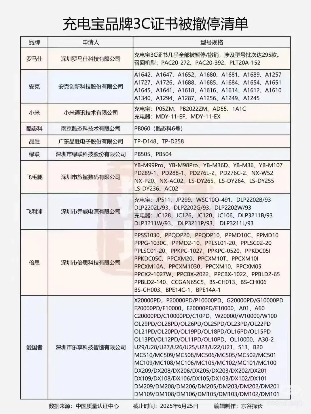 此外,罗马仕充电宝的 3C 认证几乎被全行业取消,涉及型号批次达295款。