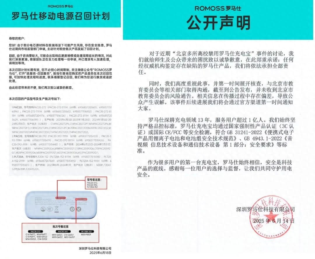 6月16日,罗马仕官方发布召回公告,召回2023年6月5日至2024年7月31日期间制造的部分罗马仕移动电源,涉及三个型号,共计491745台。