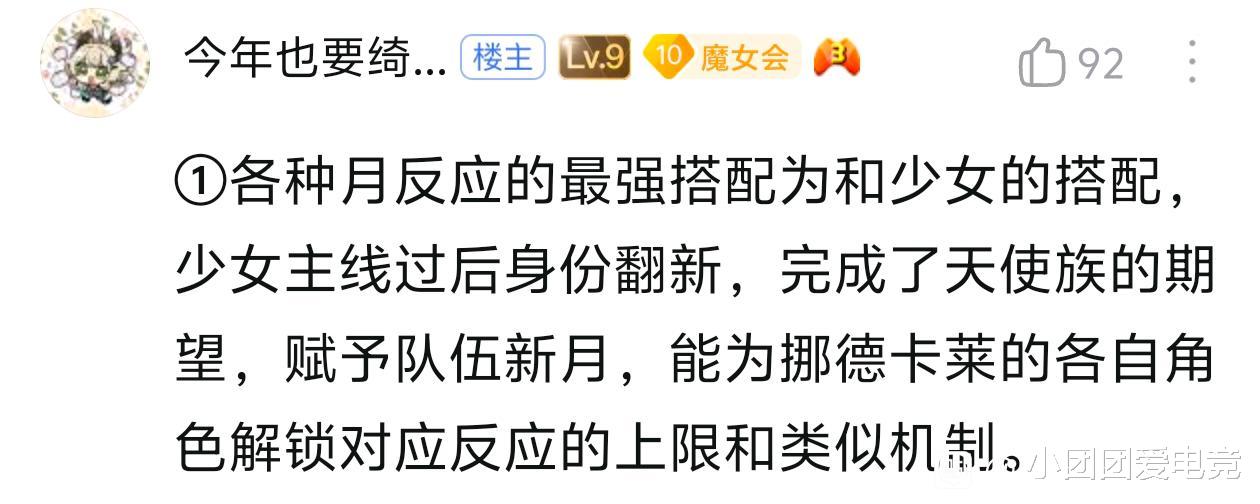 最后就是有关版本主推角色少女哥伦比娅了!目前对于少女的定位依旧是争议不断,不过从这位战绩非常多的绮良良舅舅的说法来看,少女是可以进入所有月反应最终配队,机制是解锁对应反应的上限和类似机制,所以我觉得少女可能还是偏辅助的角色,并不像玛薇卡偏主c的模板。