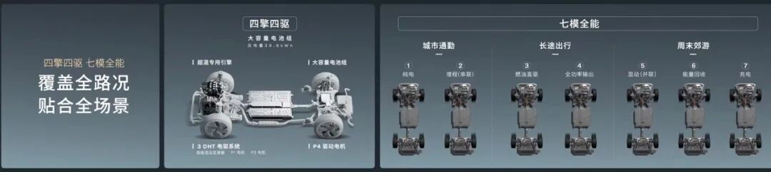 沃尔沃全新XC70搭载1.5T混动专用发动机,最大功率可达120kW,热效率超44%。配合3档混动变速箱,实现电机与发动机的灵活动力输出和能量管理,覆盖全速域。P1+P2+P4高性能电驱系统:P1电机(最大功率60kW)高效发电+参与动力输出,保障能量循环;前P2电机(最大功率107kW)驱动前轮+动能回收;后P4电机(最大功率156kW)驱动后轮+动能回收,实现智能四驱。沃尔沃全新XC70油电双能源并行,支持多种动力模式随意切换,既有纯电带来的电感化使用体验,又兼具豪华油车行驶质感,综合续航超 1200km。