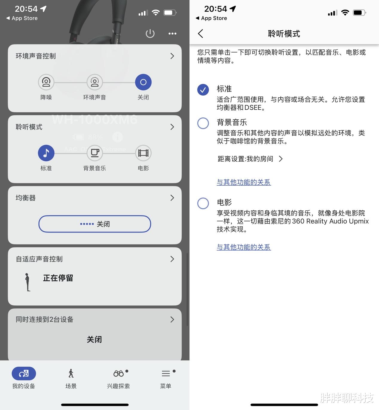 另一个颇具趣味的功能,是这次新增的多种的“聆听模式”。它提供了标准、背景音乐、电影三种音效模式可切换,其核心在于通过模拟不同的声场来营造多样化的听感体验。