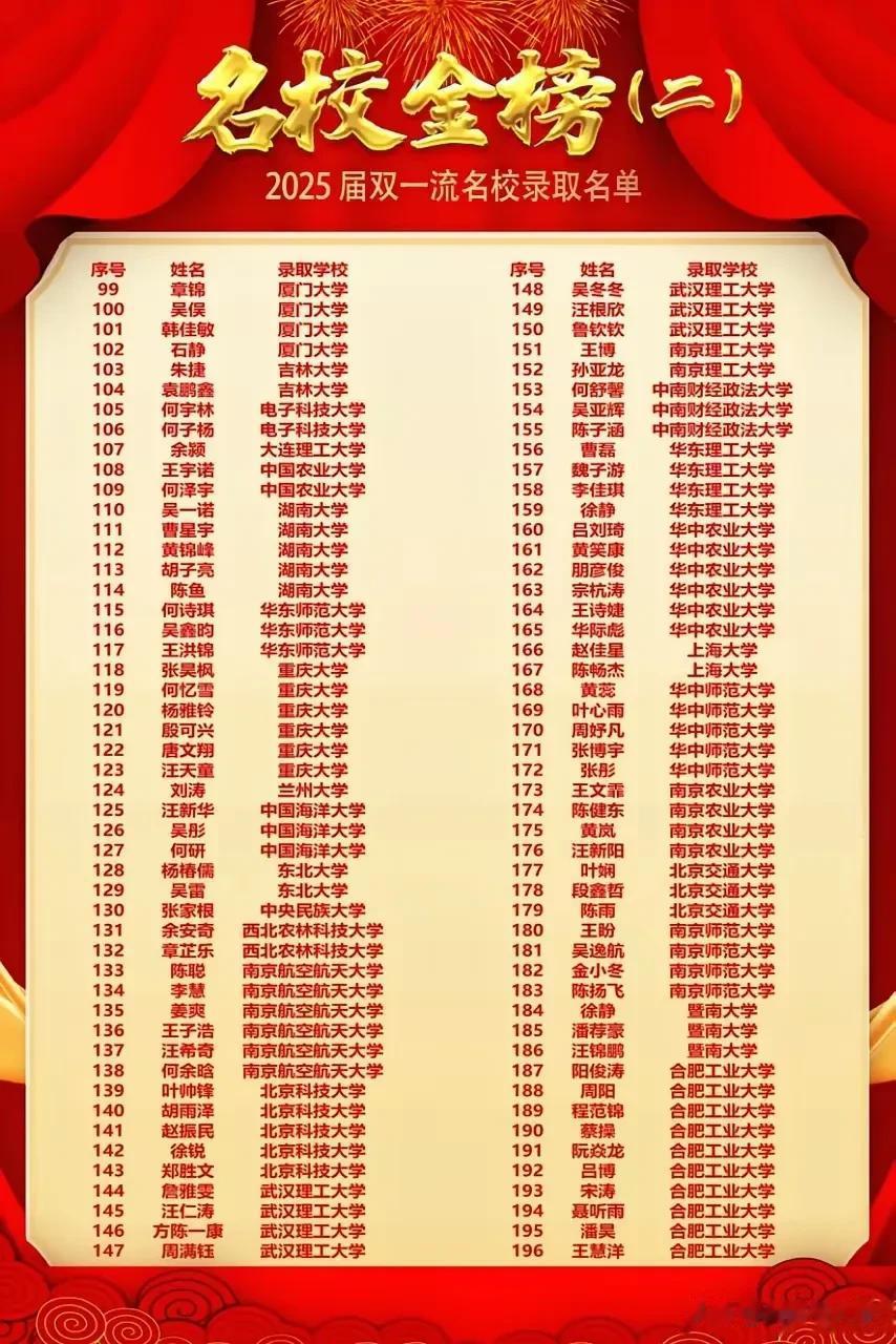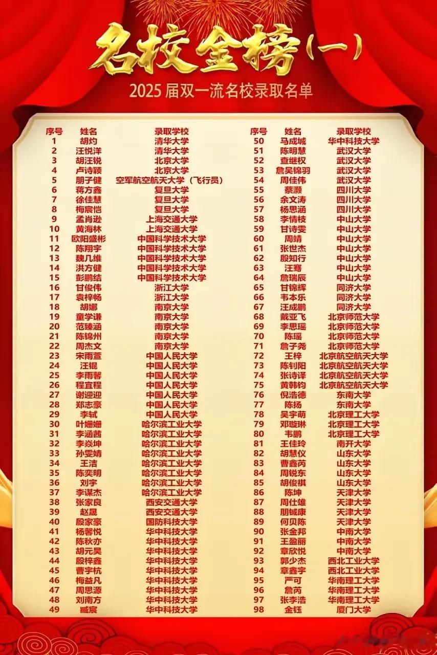 太湖中学2025年高考录取清华大学2人、北京大学2人,985院校131人,C9院校达31人,具体如下: