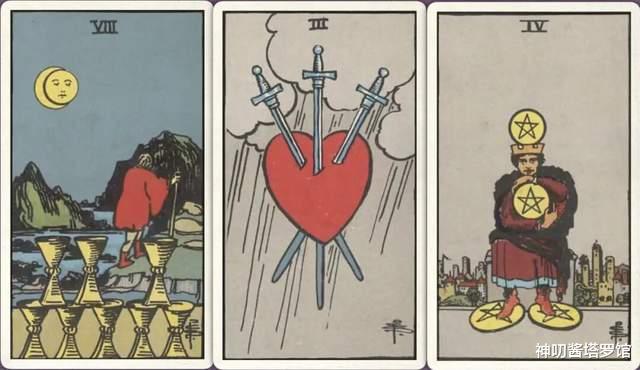 牌:圣杯八+ 宝剑三+ 星币四+
