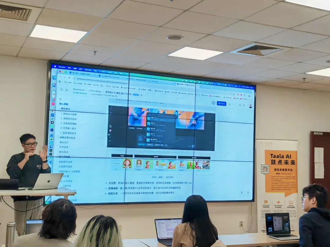 因此,本场实战分享重点着眼于“如何将AI工具深度嵌入创作流程”,在Taala AI联合创始人张弘指导下,同学们跟随他一起使用即梦AI,根据提示词进行文生图、图生视频等创作,亲身体验AI工具如何极大提高内容素材的生产效率,成为新媒体运营工作中的技能。