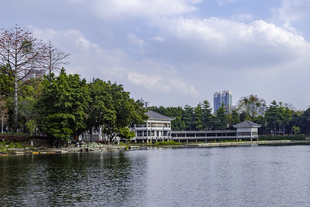 花5元买一包鱼食,蹲在九曲桥上投喂,成群锦鲤翻涌而来,金红一片,治愈感拉满。湖边长椅上,有人静坐发呆,有人轻声闲谈,阳光穿过树叶洒下斑驳光影,广州最舒服的松弛感,全都藏在这里。