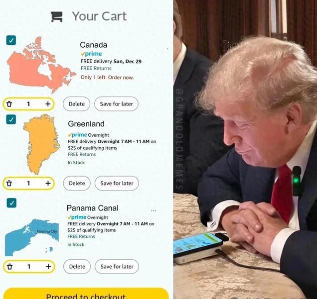 这一次,特朗普的“购物车”出圈了。图上写着“我们回来了”,而他的购物车里竟赫然列着三个“商品”:加拿大、格陵兰岛和巴拿马运河。这是玩笑还是宣告?全世界都在试图解读其中的深意,而被“加进购物车”的国家和地区,恐怕连愤怒的时间都来不及,后背已经凉透了。