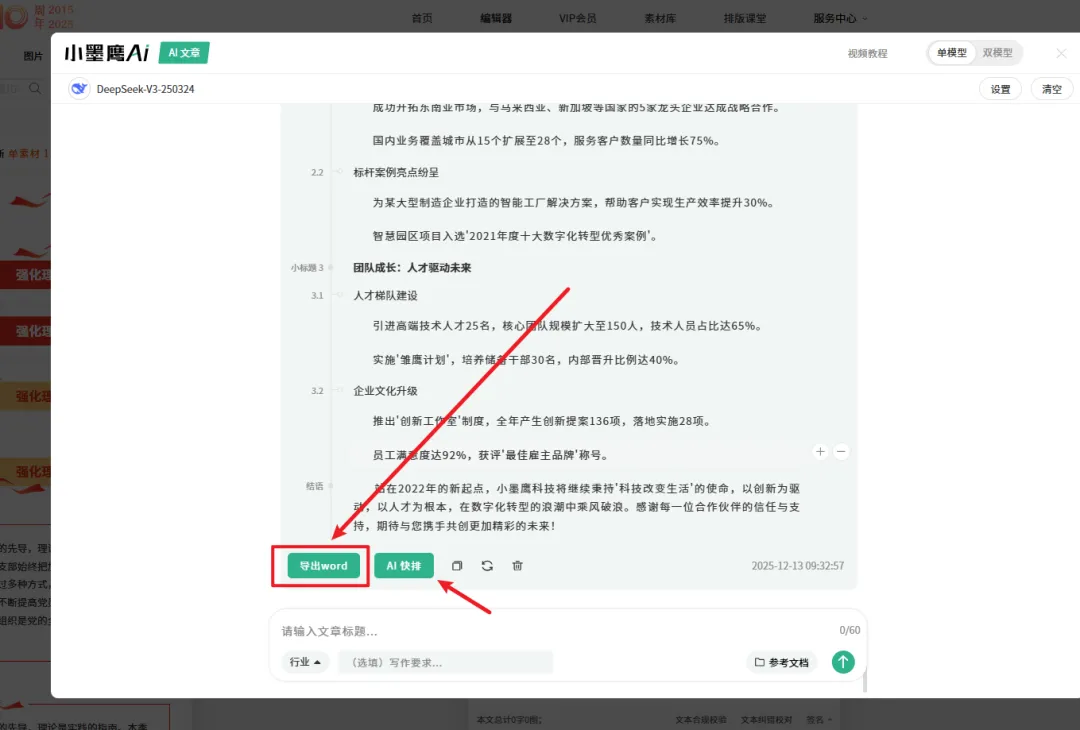 如果你用像小墨鹰这样的编辑器里的AI工具生成了文章,不想直接发布到公众号,而是需要一份能在电脑上自由编辑的Word文档,那么“导出Word”这个功能就是为你准备的。
