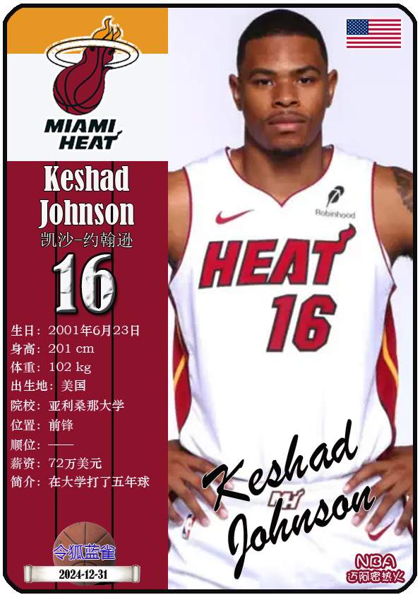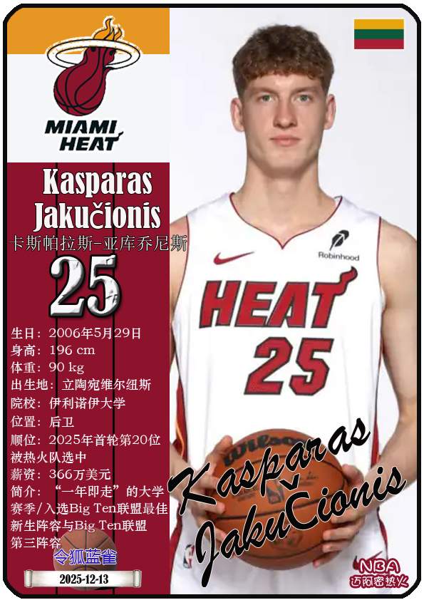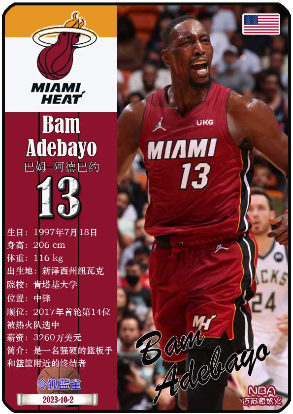 NBA迈阿密热火队成立于1988年,距今已有37年历史。截至2025年12月13日,球队主教练是埃里克·斯波尔斯特拉,队内拥有球员巴姆-阿德巴约、泰勒-希罗、安德鲁-维金斯等。本期以球星卡的形式展示目前NBA迈阿密热火队的17名球员(按球衣号码排序):