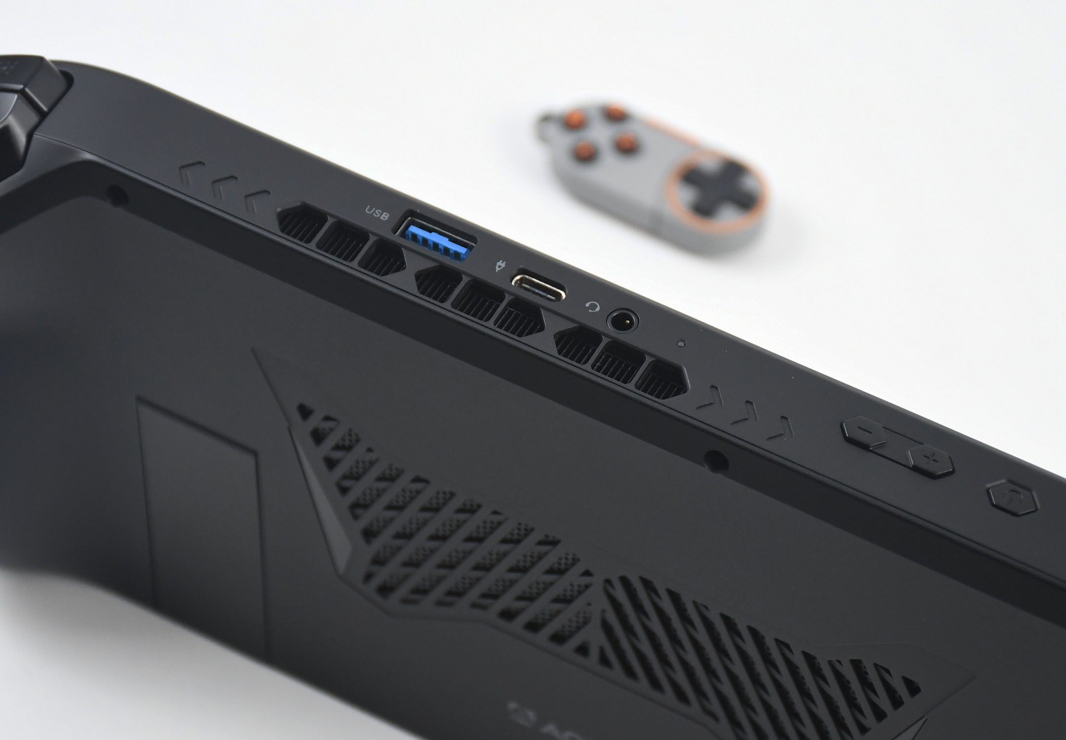 尾部位置这里设计则比较简洁,只有USB-C 4.0、Oculink以及Micro SD卡槽。有些小伙伴或许不太了解这个Oculink接口,该接口能实现以最小的损耗外接显卡坞,进一步提升设备的性能。