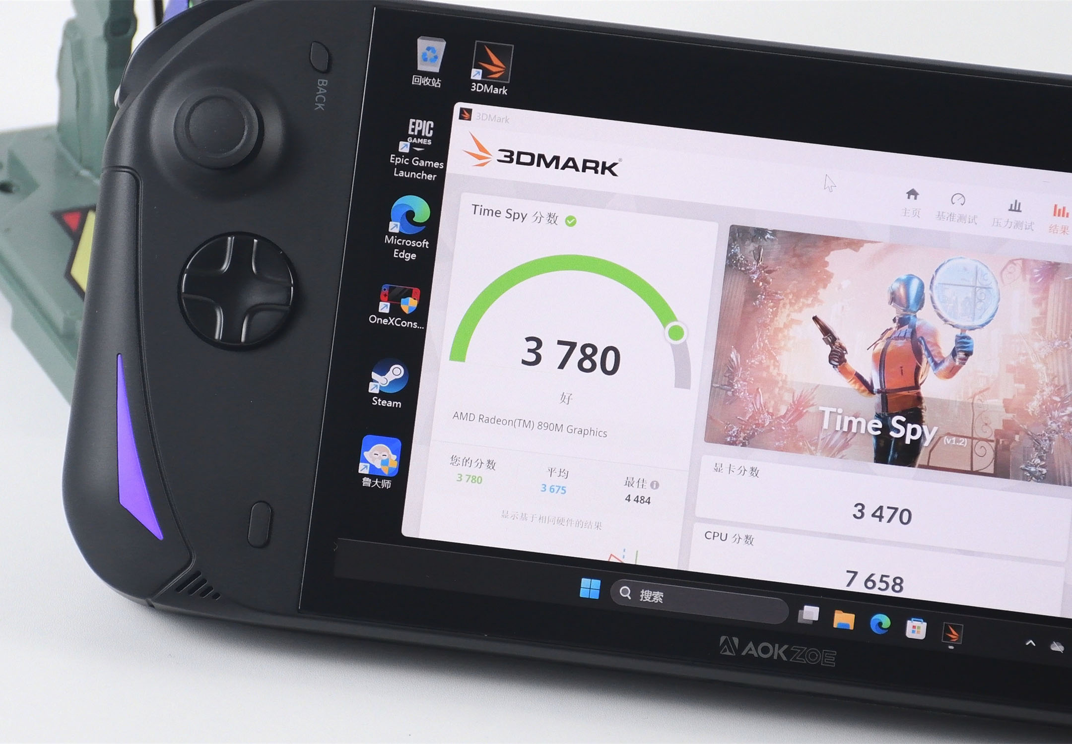 现在换用3DMARK选择Time SPY项目进行测试,能看到AOKZOE A1X的显卡分数为3470、CPU分数则为7658。