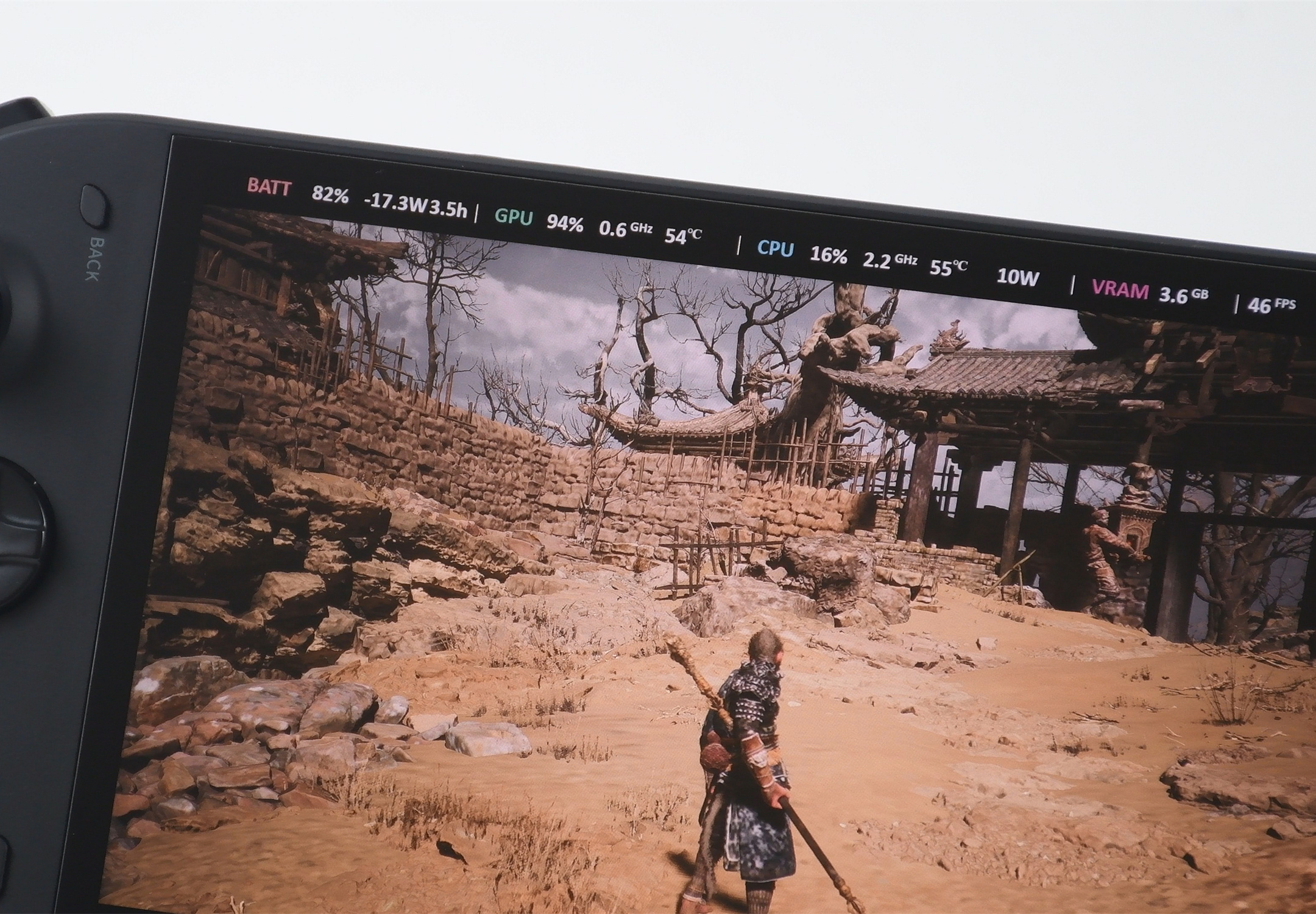看了那么多AOKZOE A1X在各项软件下的测试成绩,现在该来看下这台PC游戏掌机游玩3A游戏的具体表现了。首先在CPU满功耗下,也就是将运行性能调到30W,分辨率为1200P,画质为低,在这样的设置下游玩《黑神话:悟空》,当前游戏场景帧率在70左右。