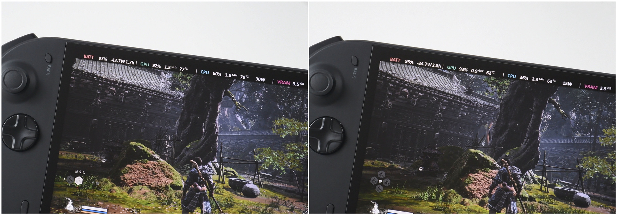 有时候为了保证续航,我们可能会调低CPU功耗去游玩,像在15W功耗、1200P分辨率、低画质下游玩,当前游戏场景帧率则为60左右;设置成高画质游玩的话,这时候的帧率降到了40左右。