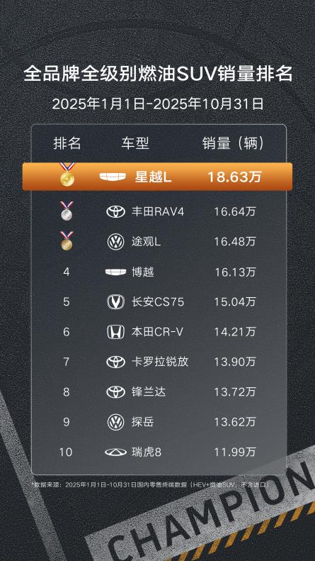 必须承认,当下,燃油车市场已进入存量博弈的红海阶段。然而,中国星・星越 L 却以 1-10 月 18.63 万辆的累计销量,强势卫冕燃油 SUV 销冠,走出了一条差异化破局之路。