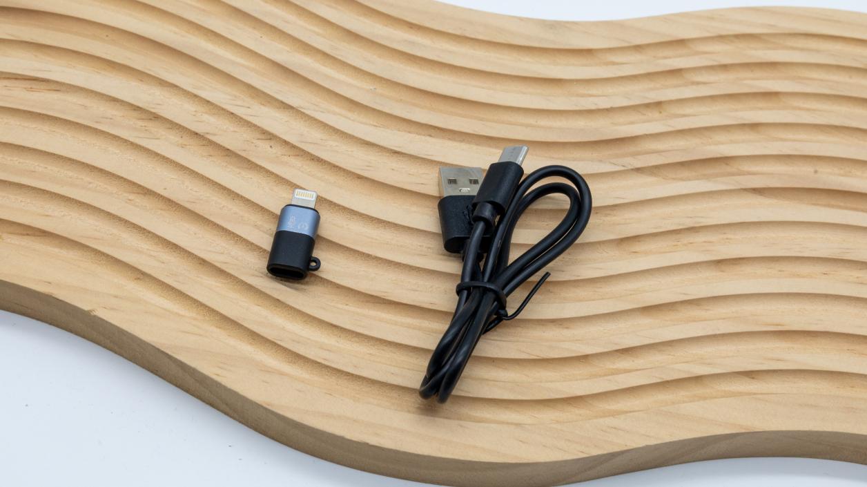 在附赠配件上其实并不多,仅提供了一条Type-C充电线以及一个Type-C转Lightning的转换接口,方便部分老款苹果用户能够直接使用。比较可惜的是,这次的配件中并没有配备防风罩,虽少了防风罩,但在实际户外收音中,其内置AI智能降噪算法仍可有效削弱环境杂音。