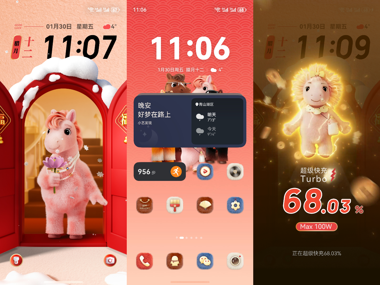 尤其是那套“马年全家福 贺岁”主题,换上之后一打开手机就感觉年味儿扑面而来。锁屏动画和毛茸茸的图标都十分戳我,充个电都电力满满,这波新年仪式感属实到位了。而且听说从1月31号到2月8号,这套主题首周上线还有五折的优惠,算下来简直像捡到宝。