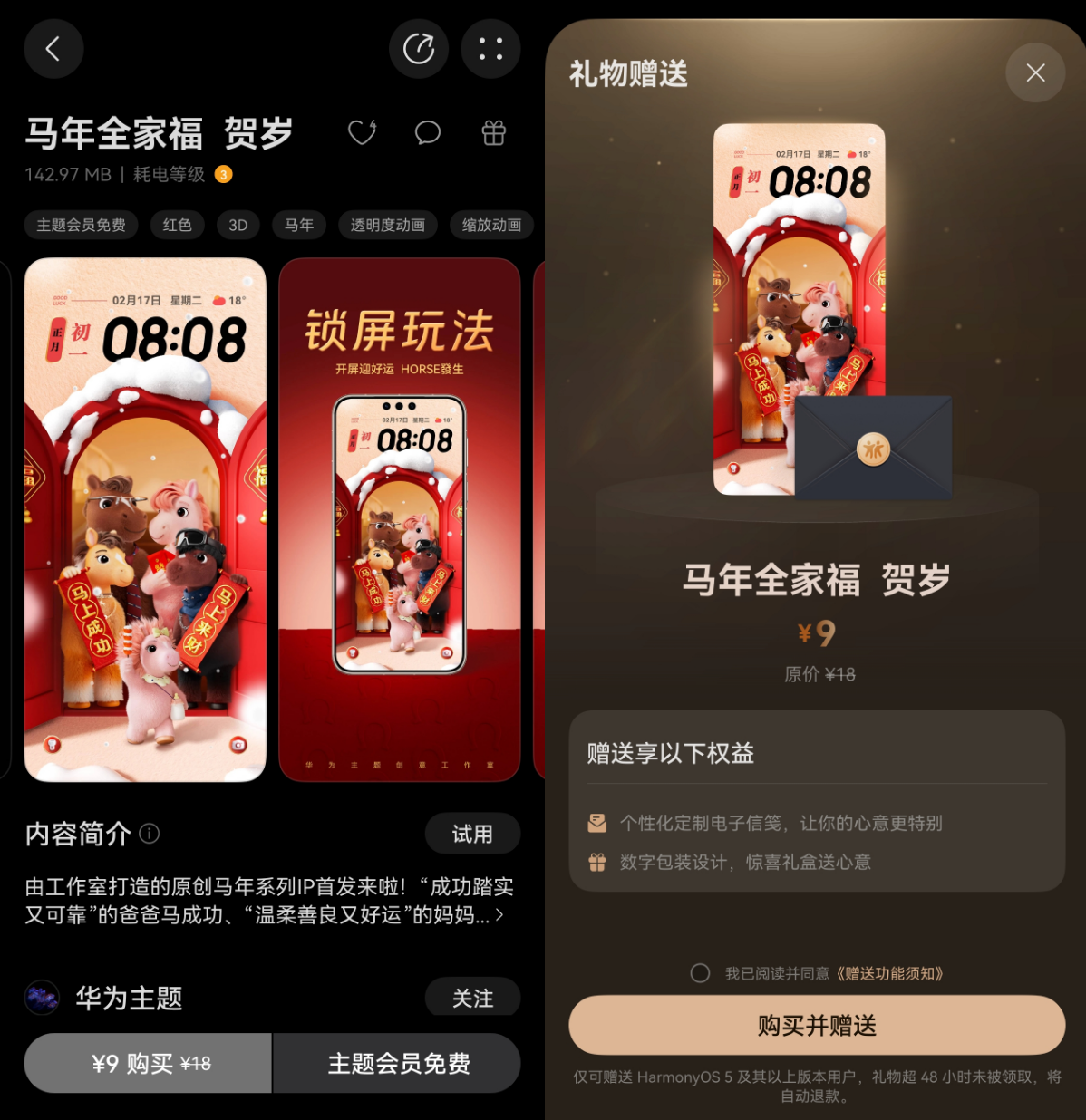 如果你想送朋友一个主题当新年礼,也能用碰一碰赠送。在详情页选右上角礼物标识,买完和朋友手机亮屏一碰,立马送达。但会员福利很香,赠送享八折,自己送过的主题要是没领取也不用担心,48小时后过期自动退款。而且还有2款新春主题同步上线,简约大气的“马年大吉”和“2026马年大吉”供大家免费使用,不要太贴心!而且非常适合想沾沾年味儿但是又不知到从何下手的人,快来试试吧!