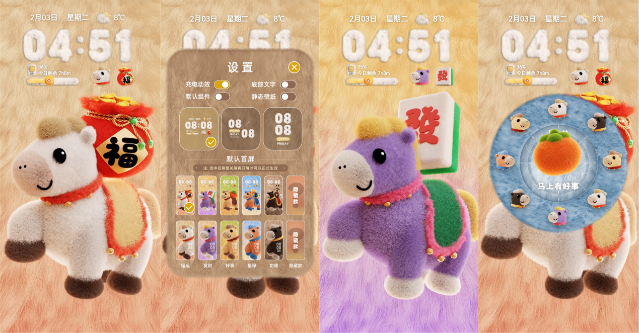 我还试了好几个马年主题,搭配百变卡片用,感觉很合适。比如在毛茸茸的《马上有五福 多图》这个桌面上搭配一个毛绒五福神,马年财运肯定不差。更别说这个主题的锁屏每一个图都是满满的祝福,不光有“马上有福运”“马上发财”还有“马上有好柿”多种毛茸茸的封面可以更换。