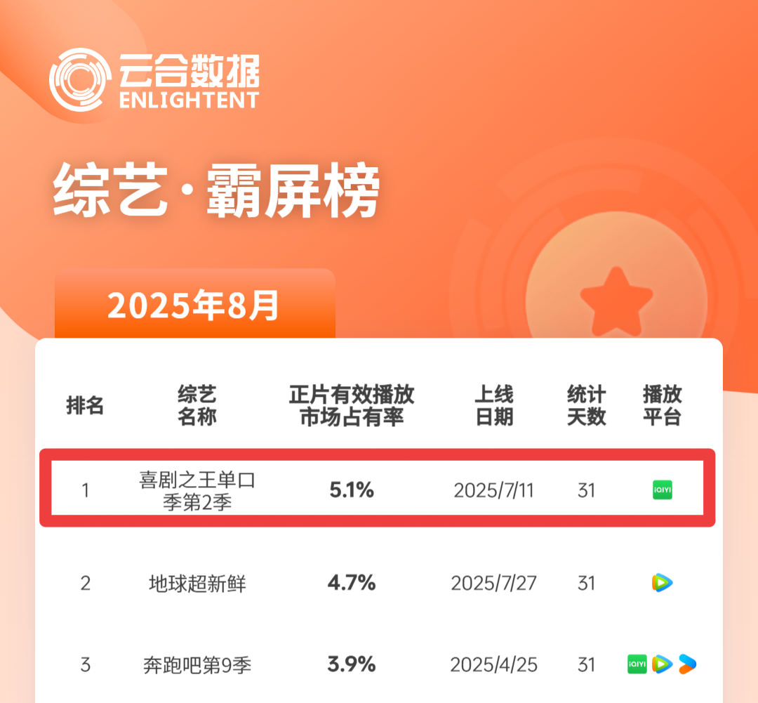 从《哈哈哈哈哈》第五季(下称《五哈5》)回归,预热暑期档综艺大盘,并在6月形成霸屏之势,到《五哈5》《喜剧之王单口季2》(下称《喜单2》)、《新说唱2025》于7月包揽云合月榜TOP3,再到8月,《喜单2》热度继续攀升,登顶云合月榜TOP1……爱奇艺几乎每个月都有爆款综艺,牢牢站在暑期档顶端,一次次引爆全网讨论。