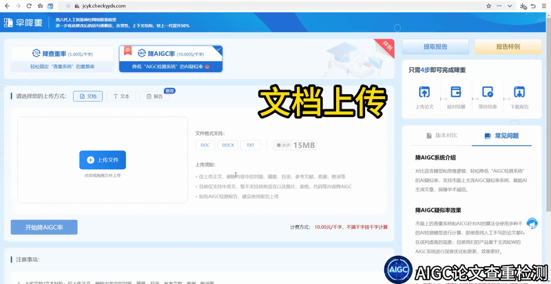 早降重辅助工具,支持中、英文降重复率+降AIGC率。与普通的降重辅助工具不同,早降重可根据论文写作方式和阶段的不同,提供3种上传方式降重(文档、文本、查重检查报告),智能降重后的结果[对照版]可以在线与原文同屏对比,还能在线免费手动润色微调(同样提供句子修改建议和同义词参考库),极大提升了修改效果和效率。