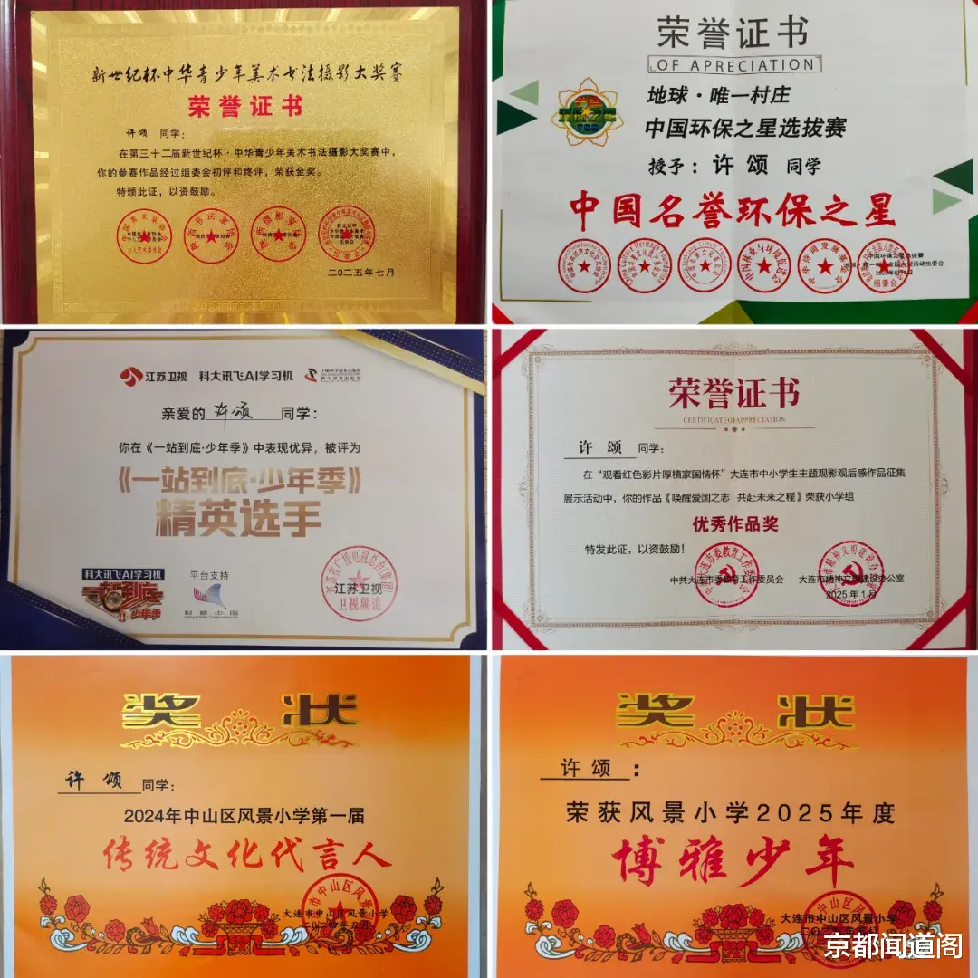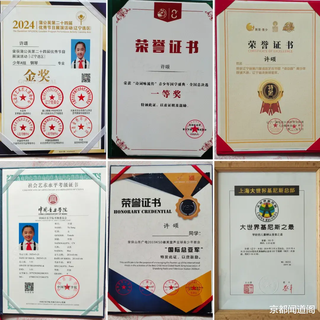 综艺舞台大显身手,许颂在各类赛事中也是出类拔萃,她取得了一系列优异成绩: 2019年7月,成为《中华小英才》杂志第四期封底人物,同年9月个人词条被收录进《百度百科》; 2019年8 月,获山东广电最美童声“全球青少年歌会”幼儿组国际总亚军;2019年12 月,获第九届“中国环保之星选拔赛”全国总冠军;2021年7月,入选《风云人物》杂志“大世界基尼斯风云人物”专刊;2023年8月,获第八届“诗词咏流传”青少年国学盛典全国总决赛一等奖;2024 年10 月,晋级第九届“诗词咏流传”青少年国学盛典全国二十强,获全国特等奖;2025年7月,获“新世纪杯中华青少年美术书法摄影大奖赛”书法金奖。如今,许颂已持有国家京剧院京剧六级证书、中国音乐学院钢琴九级证书,还是中国硬笔书法协会少年儿童书法分会会员,这些成绩,是她多年坚持与热爱的最好证明。