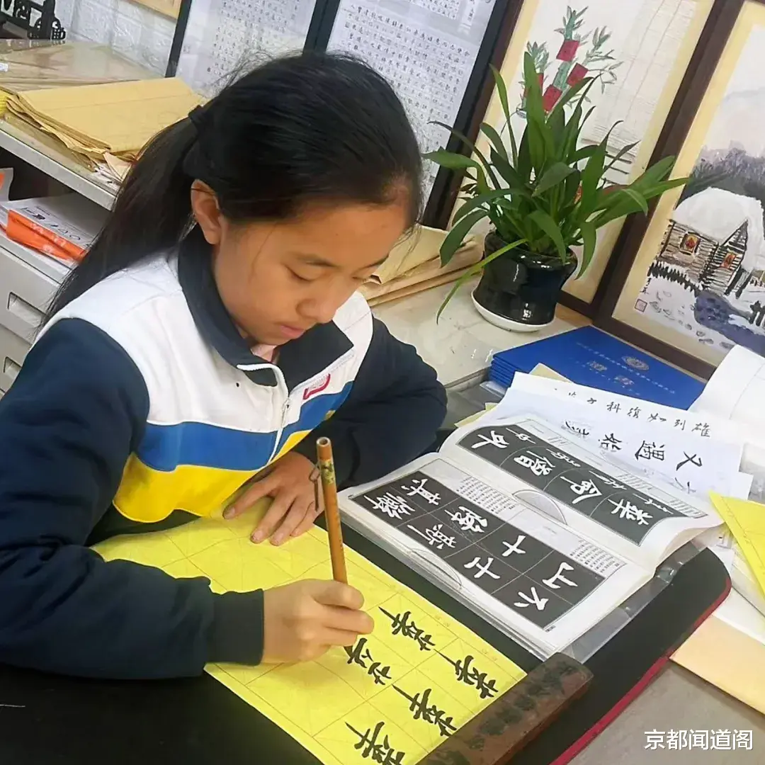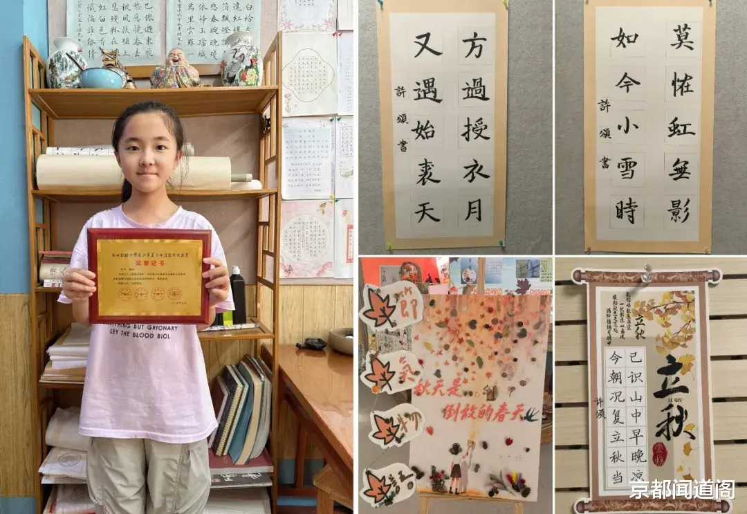 在学校橱窗里,许颂的硬笔与软笔书法作品格外引人注目,难怪她能够获得书法比赛金奖。但她却很谦虚:“感觉自己的字还有很大上升空间。” 她介绍,学校有书法课,自己小时候也专门学过,所以一直很重视书法练习,“现在硬笔比软笔稍微好一点”。