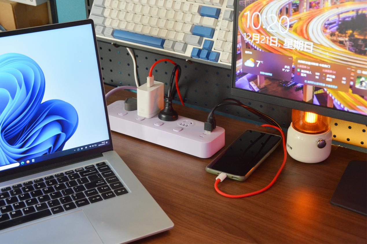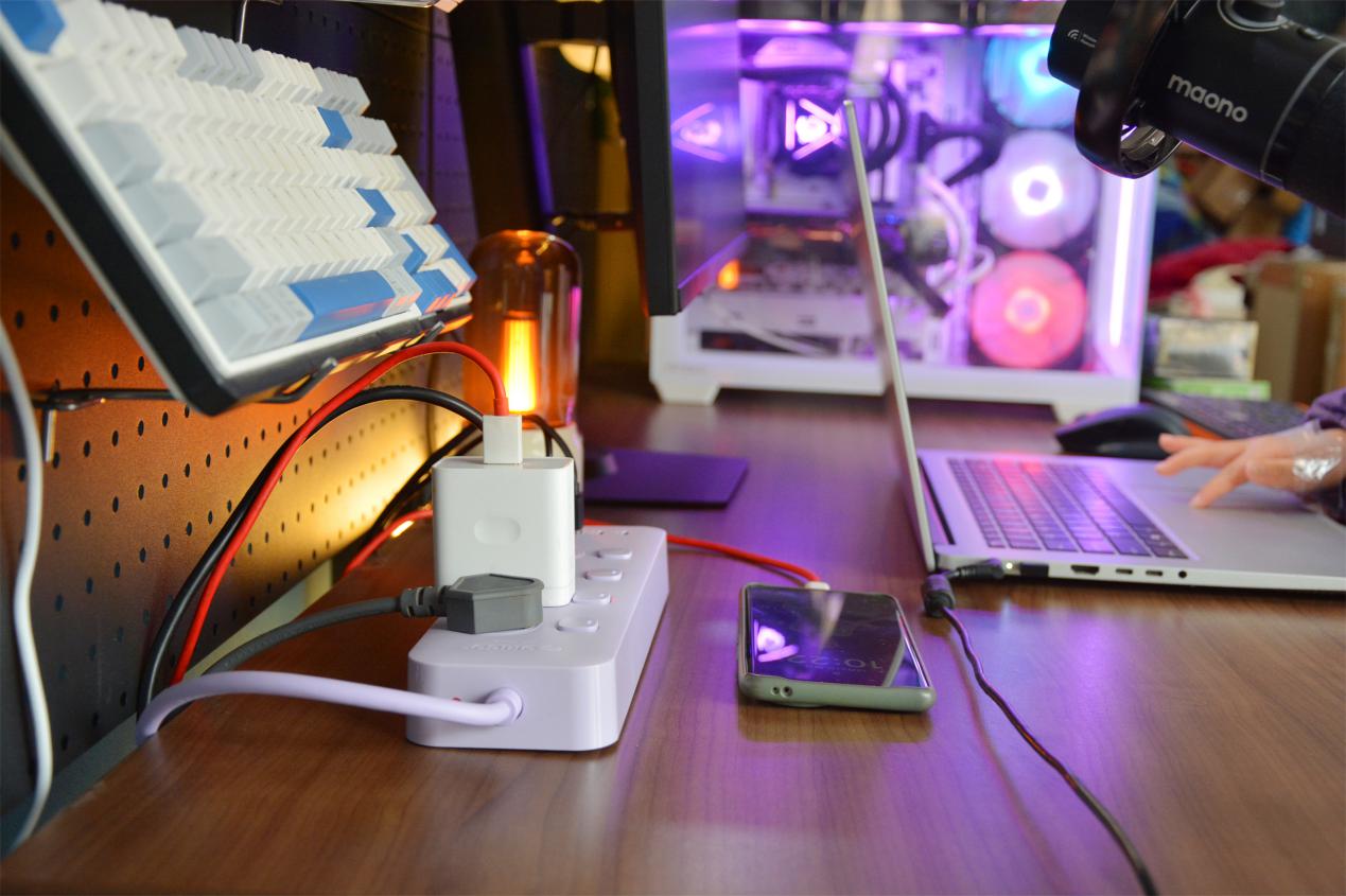 实际使用下来,奥睿科分控小胖条排插居然顶起了整个桌面的“天”。2500W的额定功率,能同时容纳多台大功率电器,一个排插,搞定整个桌面的充电需求,甚至还有多余的接口被留了出来。