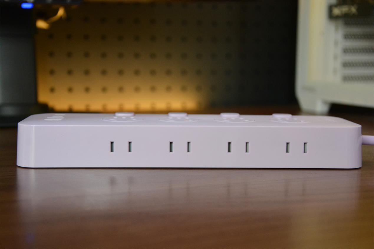 整个排插接口布局十分合理,正面包括4五孔和2A2C的USB接口。侧面还有4个两孔接口,没错,只有239*72*30mm的尺寸机身,足足包揽了整整12个接口。
