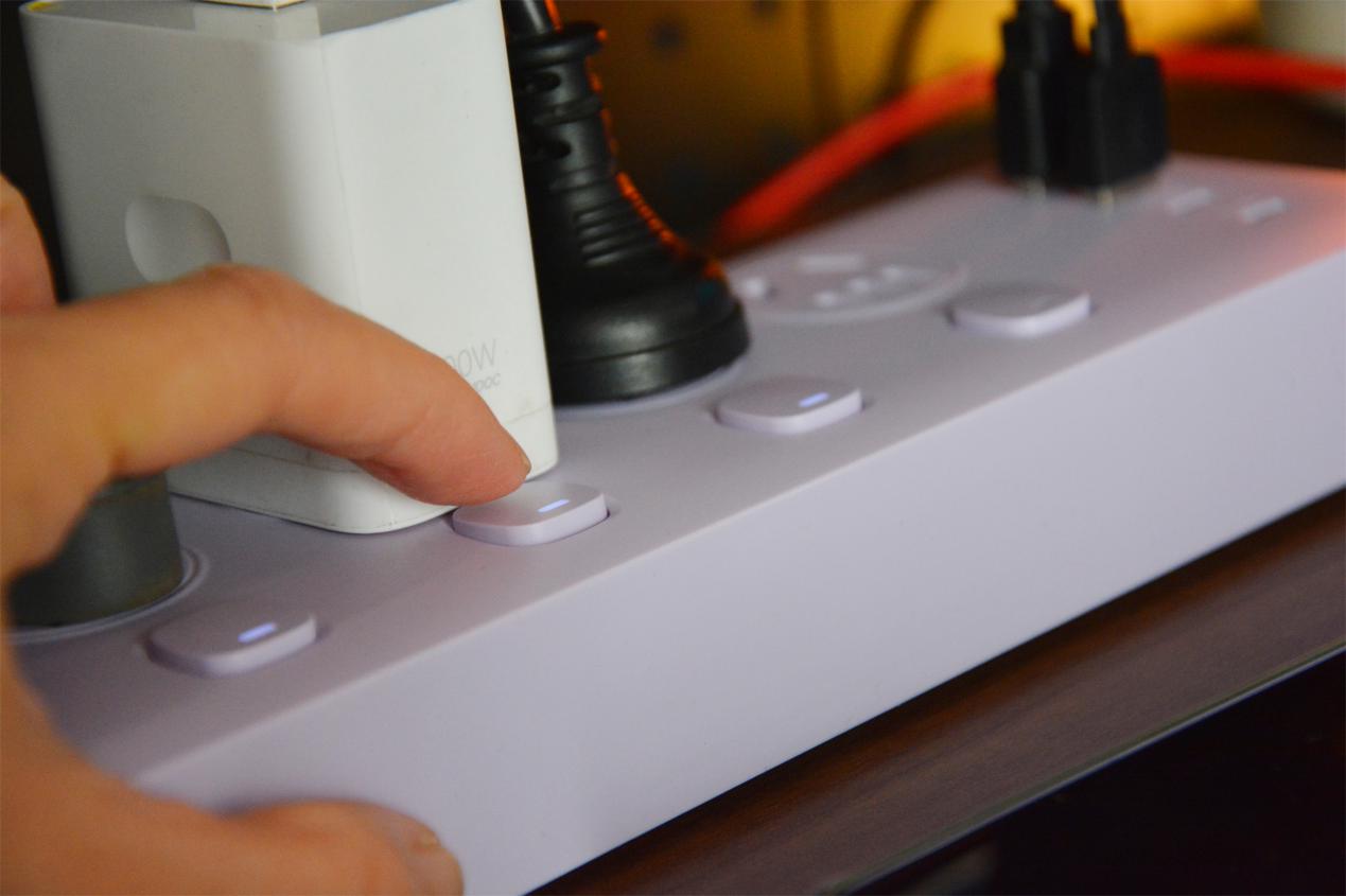 在机身的侧面也增加了过载保护,一旦功率超过安全线,排插会“自动跳闸”,只有断开电器一键复位后,才能再次正常使用。