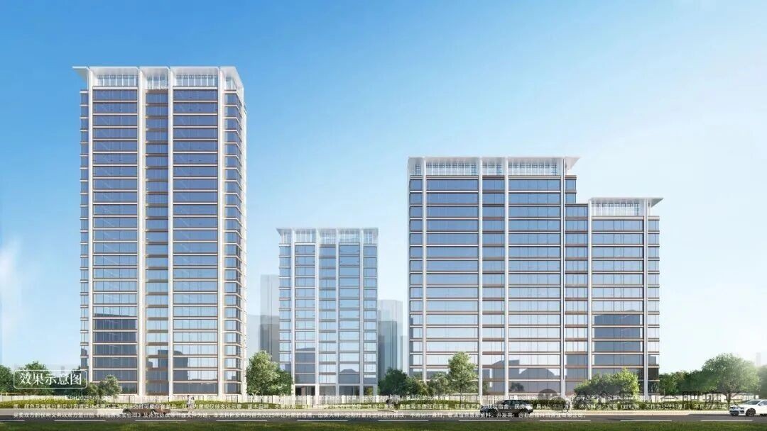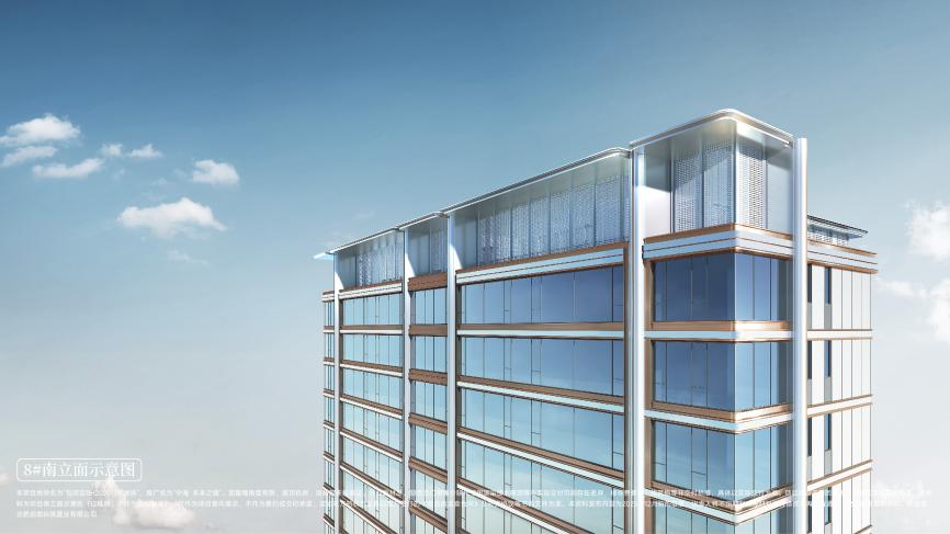 在建筑立面上:南立面采用大面玻璃与金属铝板线条结合的现代极简设计,线条干净利落,含玻量高,形成历久弥新的质感。局部山墙的玻璃运用,犹如城市夜景中的点点灯塔,不仅提升了室内采光视野,更提前锁定了政务东片区的美学标杆。