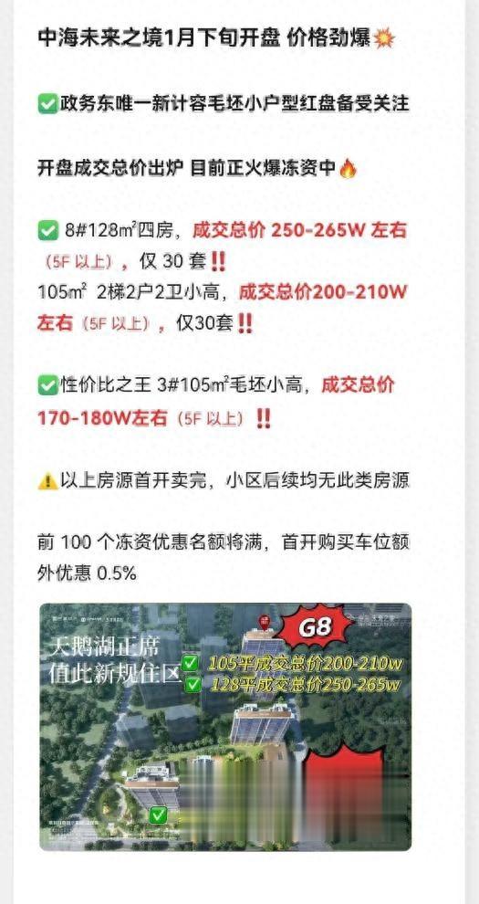 中海·未来之境将在1月底首开,诚意与力度直接拉满。直接推出了位置最优的G8号楼,也放出超高性价比的G3号楼。其中G8备受初改客群瞩目的约128㎡全能四房,实际空间享受可媲美旧规二手房约150㎡产品,而释放的成交总价主力仅250-265万元,仅约30套房源,十分稀缺,该楼栋105平米产品,总价主力在200-210万。