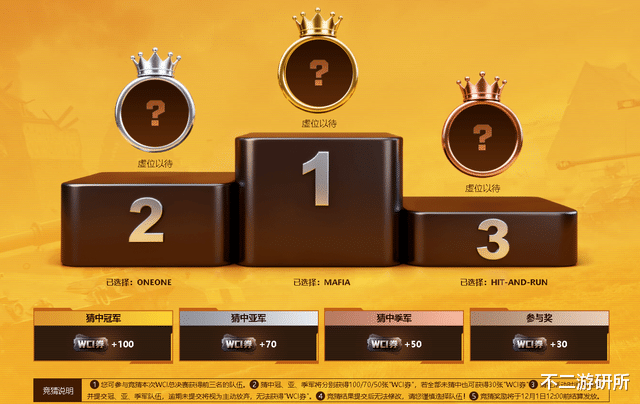 其获取门槛较低,每天前往官网签到,完成每日任务和累计观赛时长皆可获得。当然,车长们也可以参与前三名的竞猜活动,全中的话有100+70+50=220WCI券,哪怕是参与奖也有30WCI券。