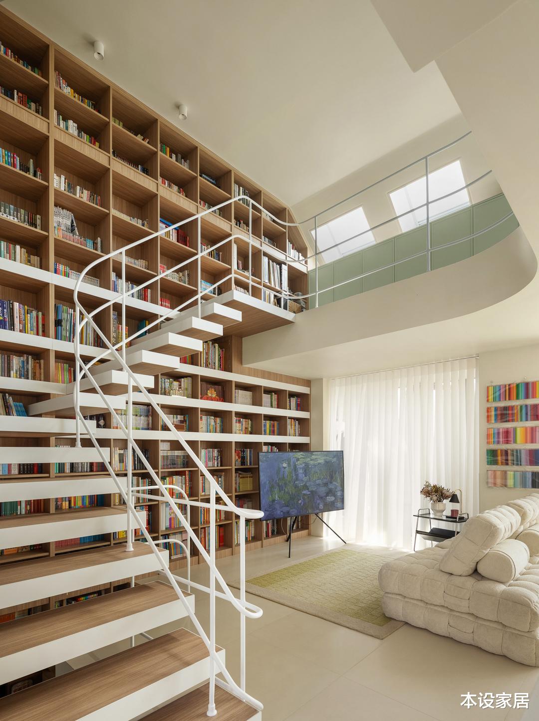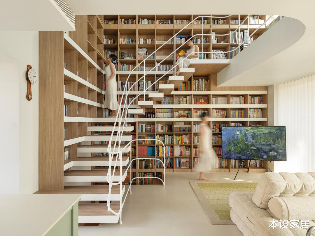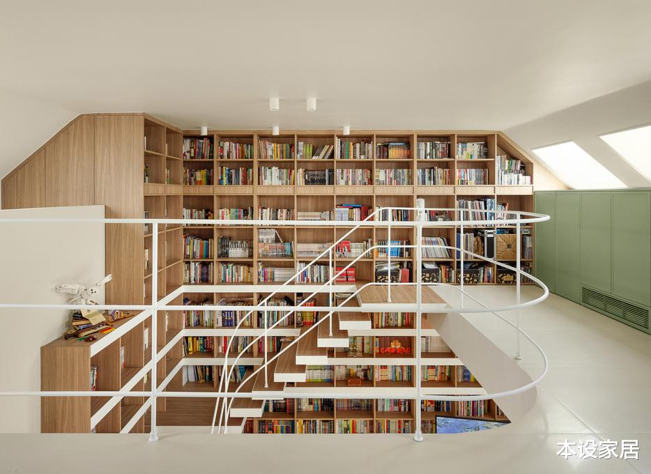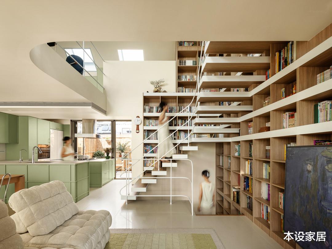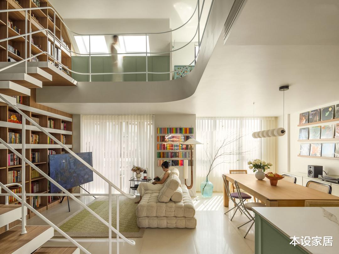 他们家是上叠别墅,由两层空间+一层阁楼组成,建筑面积160㎡,在平面布局上,打破了常规的布置方式,而是将卧室布置在1楼,减少因噪音对楼下邻居的影响,而2楼+阁楼则打造成一个贯通的公共活动空间,并巧妙地将书架与楼梯相结合做了两面书架墙。