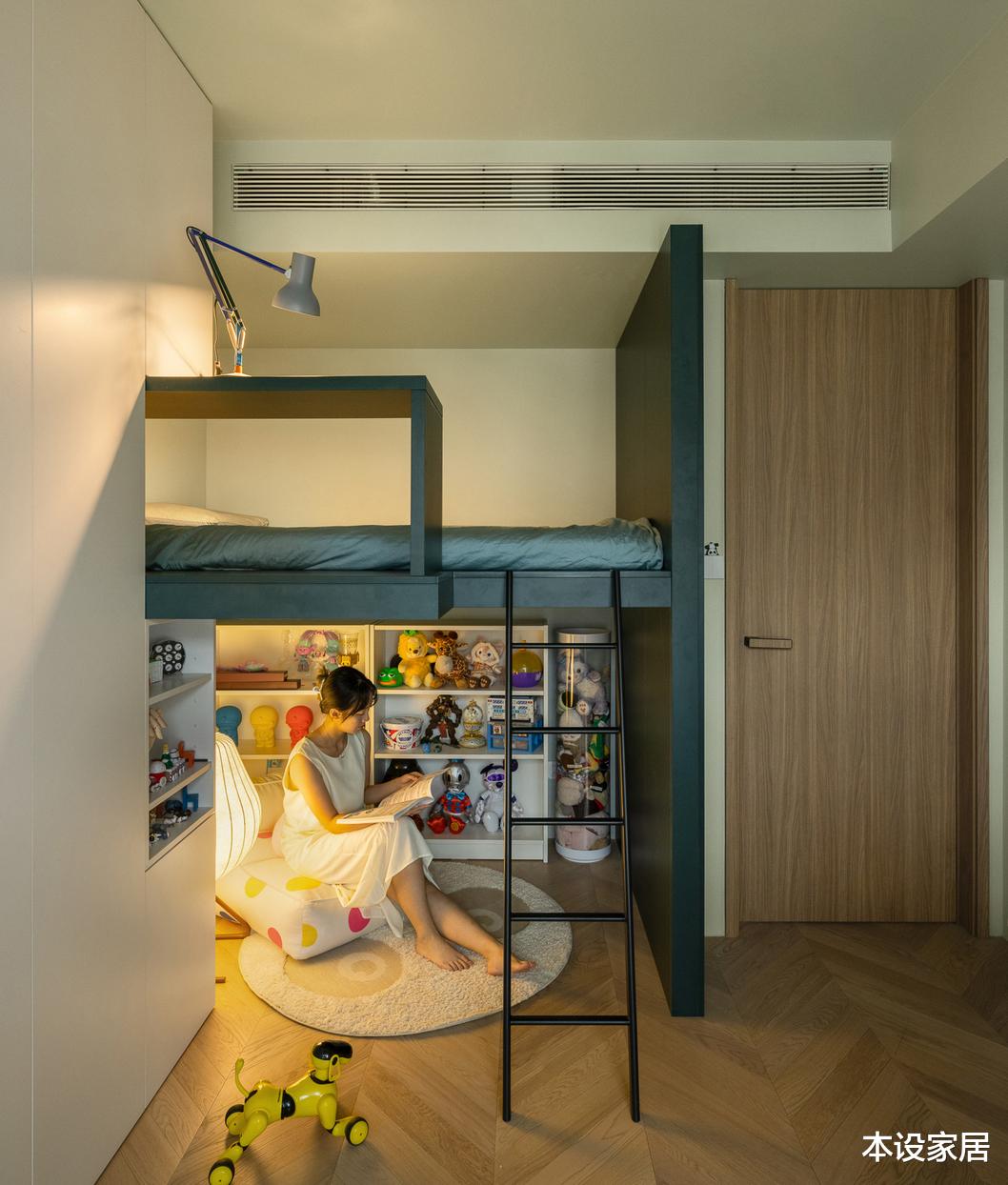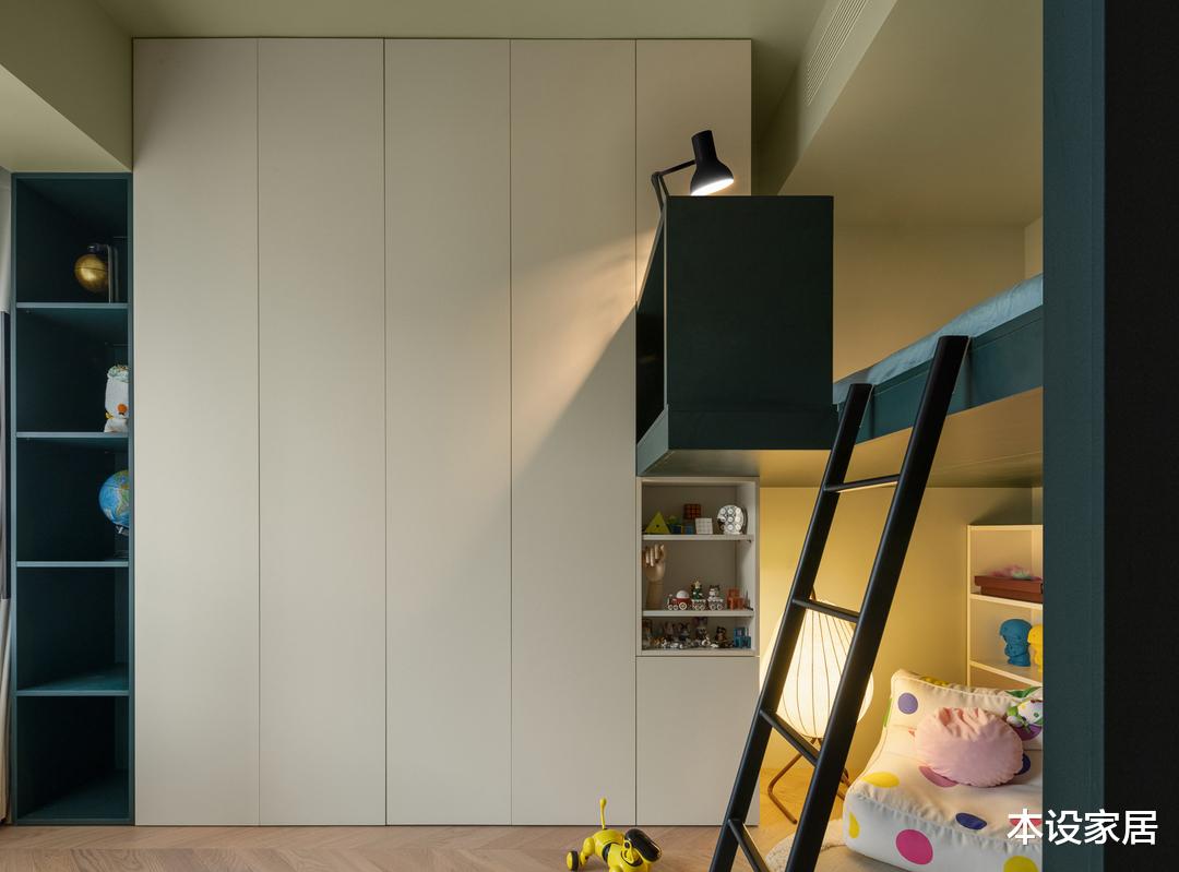 儿童房面积不大,采用上铺休憩,下面玩乐的设计,满足孩子对于专属小天地的需求。